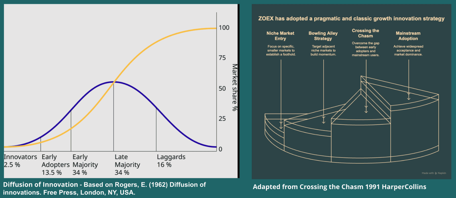 igure 5: Diffusion of Innovation + author’s interpretation of Crossing the Chasm, using wedge sizes as a proxy for greater returns and market maturity.