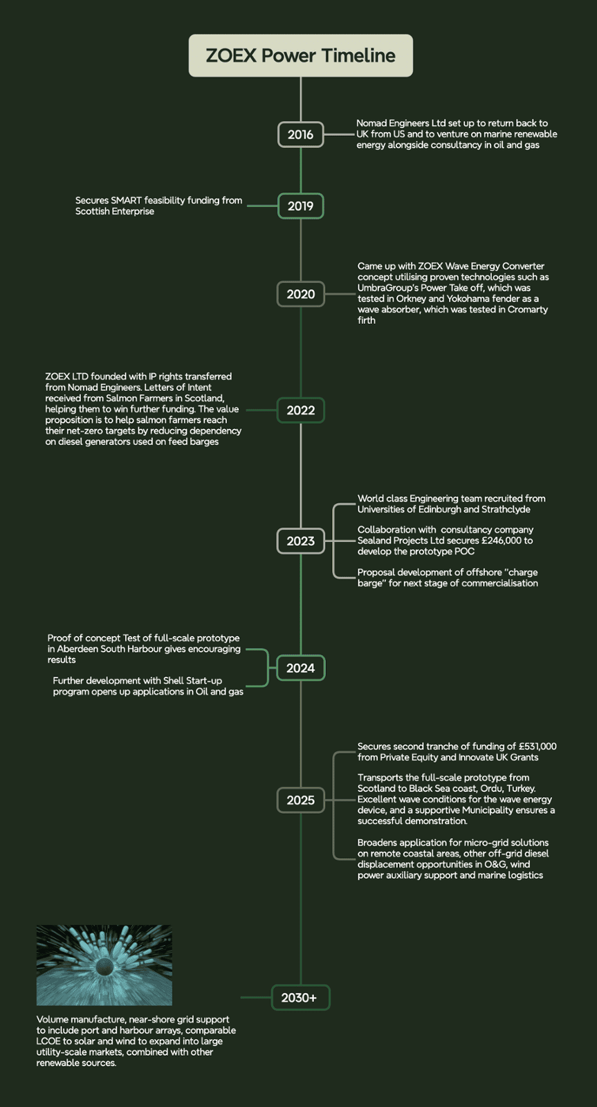 ZOEX Power was founded by Aslihan Penley, also known as Ash, who is of Turkish descent. She worked in the oil industry in Turkey, UK,Australia and the US before transition her skills to marine renewables, and location back to the UK, Edinburgh in 2017 to represent an Israeli wave energy company. After a stint at Eco Wave Power, she started her own company, Nomad Engineers, launched in 2019 following a SMART grant from Scottish Enterprise.