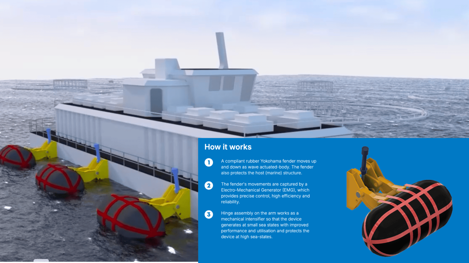 The main advantages of the ZOEX WEC are that it combines proven technology with a proprietary double-link arm mechanism, which amplifies the power of waves with relatively low heights (\<2mHs). Most other WECs require significantly higher wave heights to operate. ZOEX uses Umbra’s Ball Screw Power Take Off Device (PTO) and Yokohama fender. While the primary use case is in aquaculture, such as salmon farms operating in low Hs environments, it can be designed to survive storms up to 10 metres.